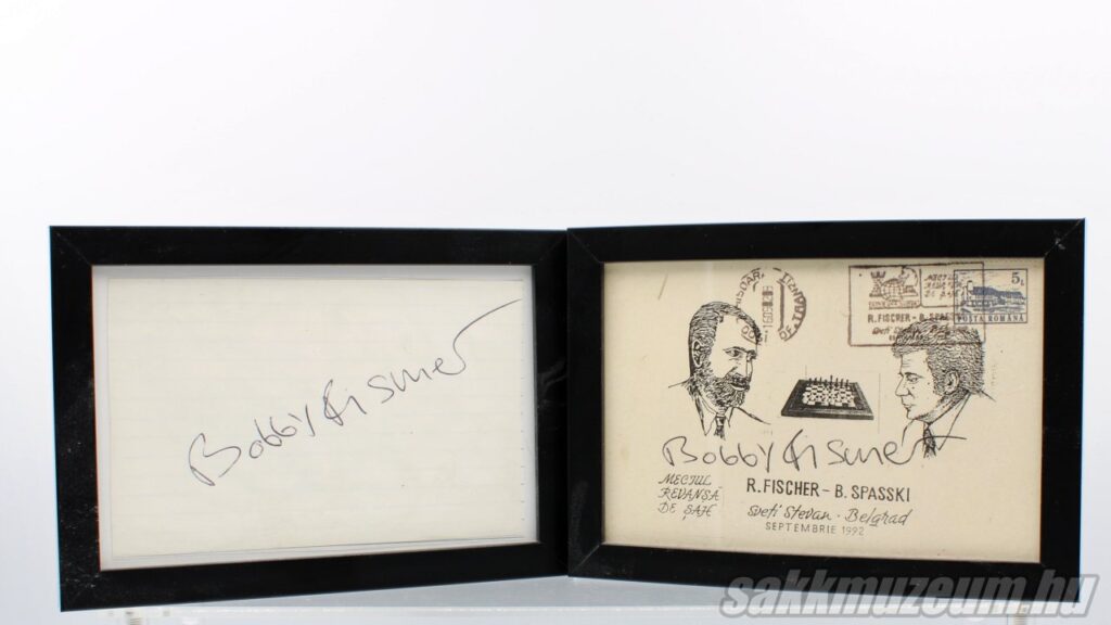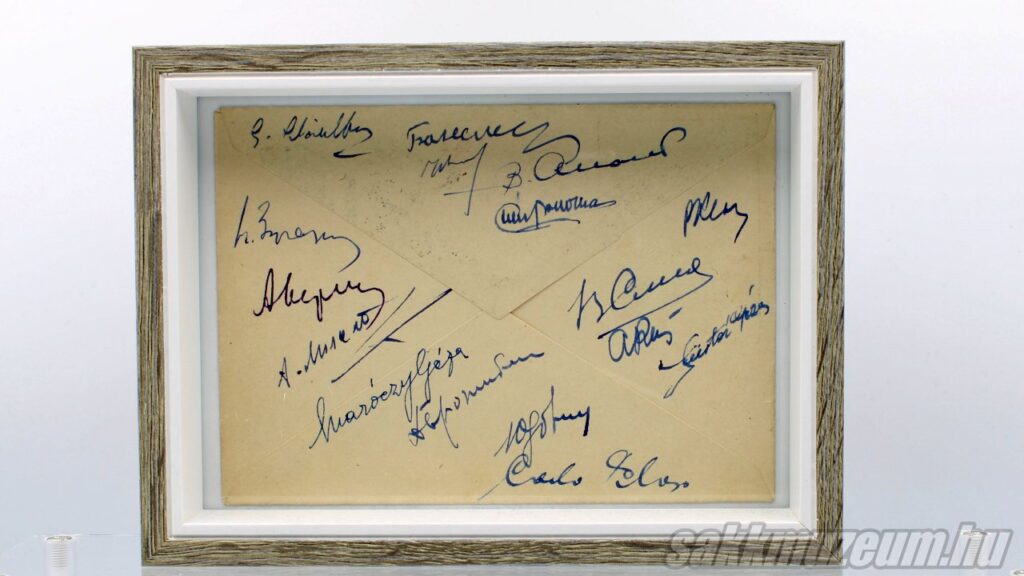 Az első képen láthatóak az 1950. világbajnokjelölti versenyen résztvevők, illetve más nevezetes személyek, például Maróczy Géza aláírásai, a másodikon pedig Bobby Fischer exvilágbajnok aláírásai.