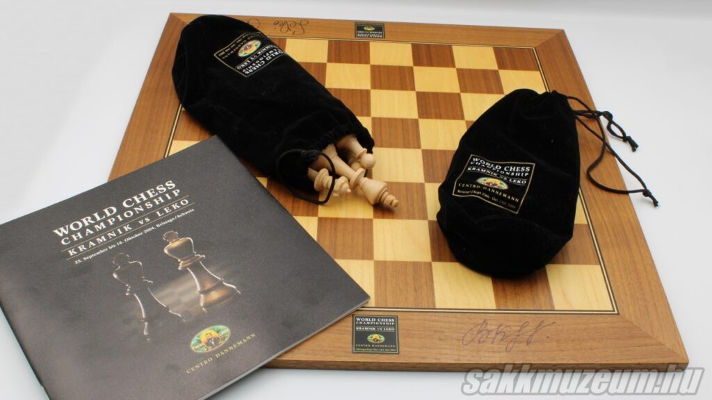 Szuvenír sakk-készlet a Kramnyik – Lékó sakkvilágbajnokság döntőjéről. Mindkét játékos aláírása található a sakktáblán.