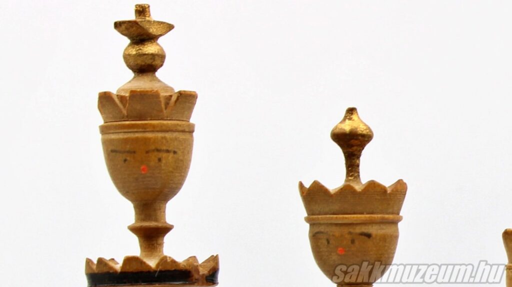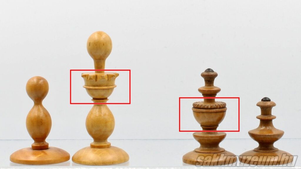 A képen két külön Biedermeier sakk-készlet figurái láthatóak (királynő és gyalog mindkettőből). Érdekesség, hogy a gyalog valójában egy kisebb királynő. Ha a királynőből „kivágnánk” a kijelölt részt, akkor szinte teljesen megegyezne a gyalog alakjával. Ennek szimbolikus jelentése is lehet: ha egy gyalog eléri a tábla másik oldalát, akkor át tud alakulni egy királynővé.