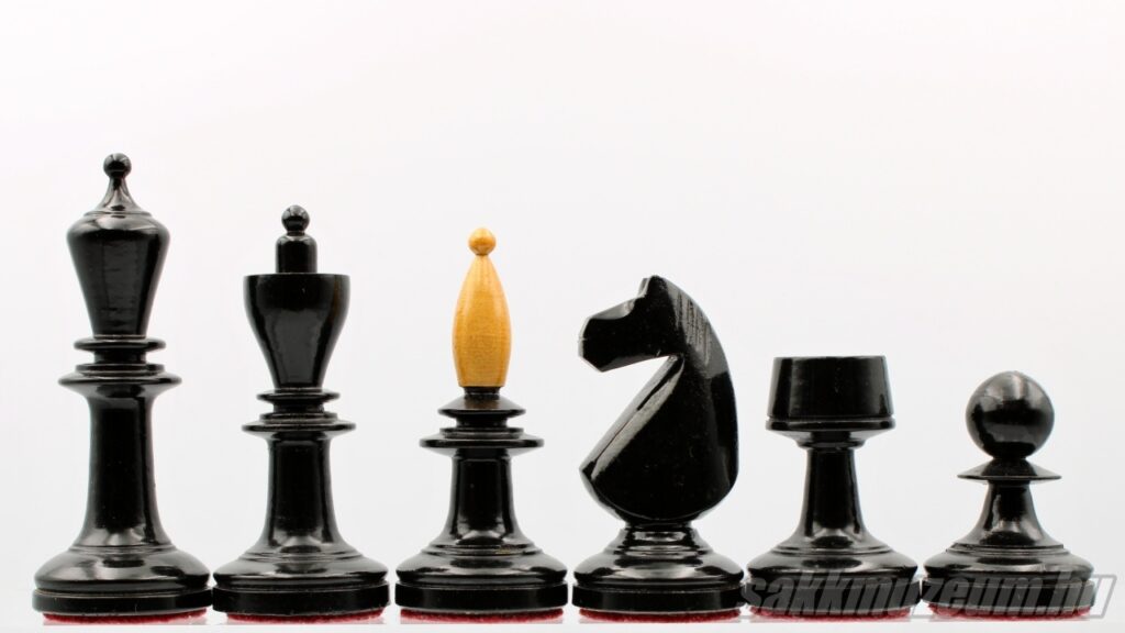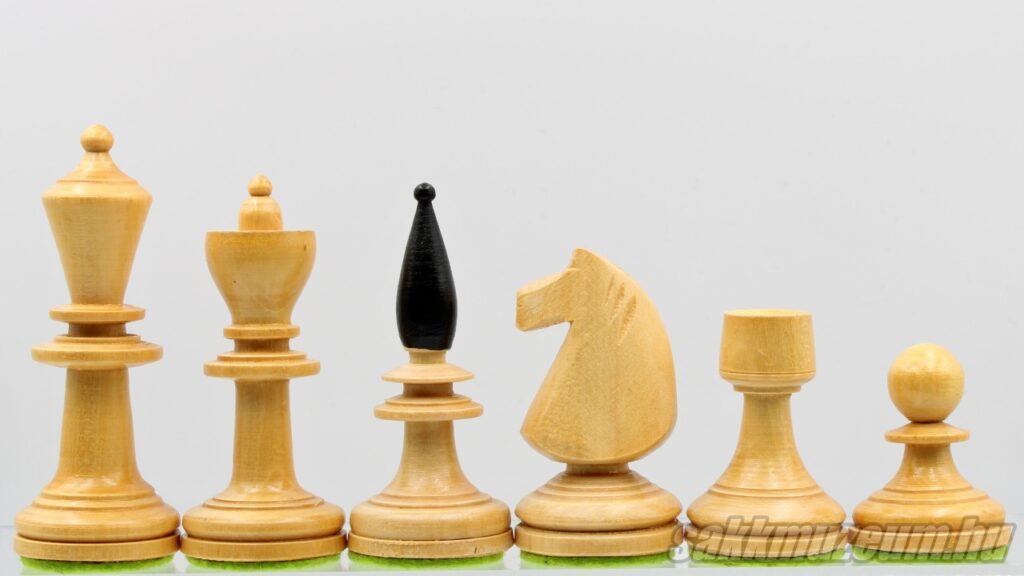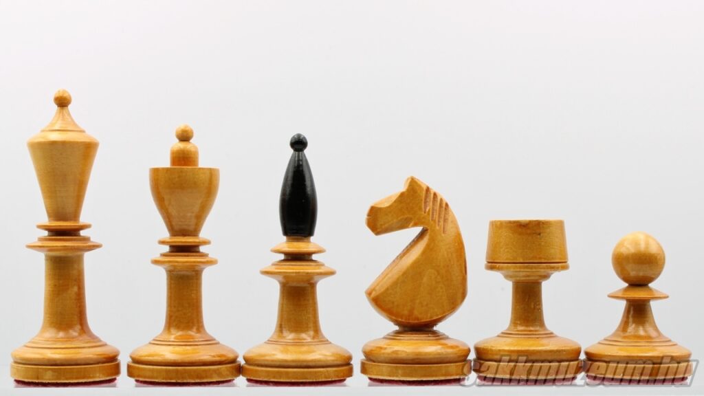 Ez a sakk-készlet azért jött létre, hogy megfeleljen az akkori nyugati mintának (Staunton sakk-készletek elvei). Ezelőtt bécsi típusú sakkfigurákkal játszottak magyar versenyeken Magyarországon. Készítése 1945 és 1950 között történt limitált számban, leginkább a Magyar Sakk Szövetség használatára. A király magassága 92 mm, a gyalog 52 mm magas. A figurák talpának átmérője egységesen 33 mm. Főbb jellemzői, melyek később készített magyar versenysakkoknál nem találhatóak: dekoratív bevágások a futó fején és a királynő koronáján, részletesen faragott huszár.